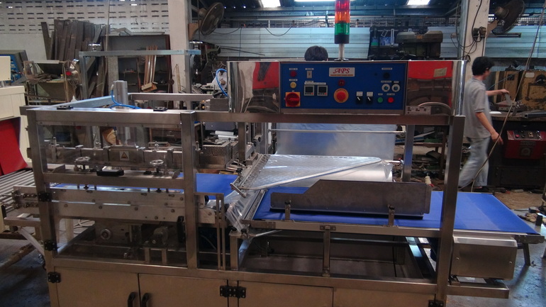 • หลังจากนั้นสายพานจะลำเลียงสินค้าเข้าสู่ตู้อบความร้อนเพื่อให้ฟิล์มหดรัดถาดสินค้า